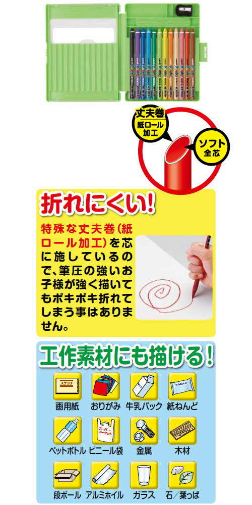 図画、工作両方できる色鉛筆特殊な丈夫巻(紙ロール加工)を芯に施しているので、筆圧の強いお子様が思い切り描いても折れにくい強度を実現しました。