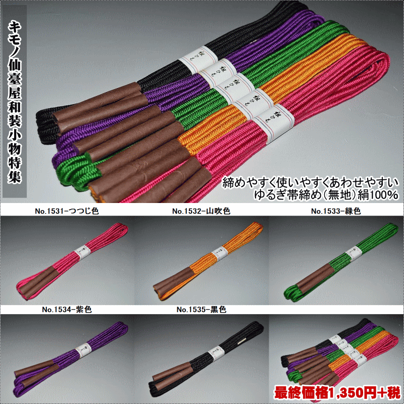 締めやすく使いやすくあわせやすいゆるぎ帯締め(無地)絹100%お買い得・並尺No.1531〜No.1535【キモノ仙臺屋の和装小物特集】