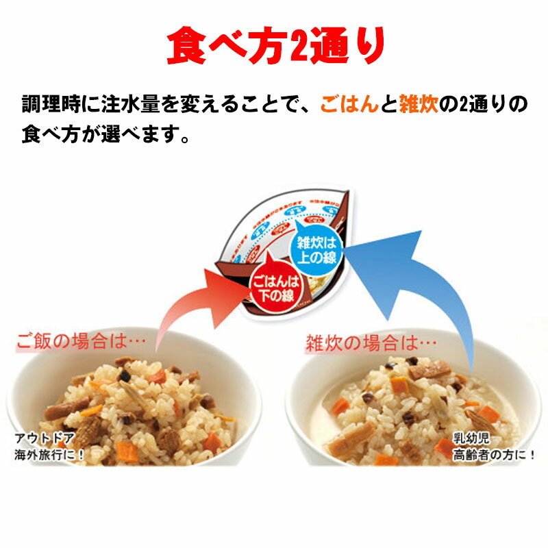 簡単に調理でき、水でも美味しく召し上がれますので、災害時やアウトドアにも最適!!また、調理時の注水量を変えることで、ご飯と雑炊の2通りの食べ方を選べます。
