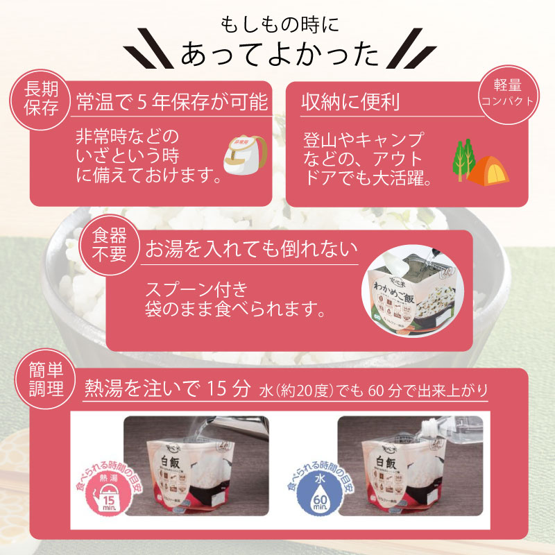 ●もしもの時に使える安心米! 5年保存が可能 特定原材料等27品目不使用で安心 コンパクトで持ち運びに便利 お湯を入れても倒れにくいスタンドタイプ 食器不要(スプーン付き) 【名称】 アルファ化米米飯(わかめご飯) 【内容量(1袋あたり)】 100g(できあがり:約270g)、スプーン付 【サイズ(1袋あたり)】 高さ150×横160×底マチ84mm 【保存方法】 直射日光、高温多湿を避けて常温で保存してください。