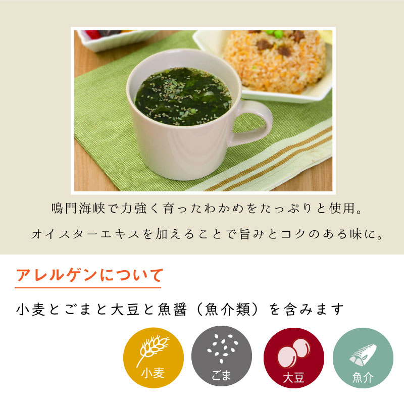 ●原材料でん粉分解物、でん粉、しょう油、食塩、ホタテエキス、酵母エキス、砂糖、オイスターエキス、発酵野菜粉末、香辛料、具(わかめ(鳴門産)、白ねぎ、ごま)/酸化防止剤(V.E) ●栄養成分(1袋あたり)エネルギー 21kcal、たんぱく質 0.5g、 脂質 0.3g、炭水化物 4.0g、食塩相当量 1.3g ●アレルギー情報小麦・ごま・大豆・魚醤(魚介類)※ 直射日光を避け、常温で保存してください。
