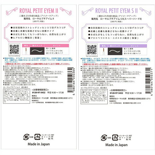 商品詳細 商品名 ローヤルプチアイムS II (ROYAL PUTIT EYEM S II)(姉妹品ローヤルプチアイムII) 内容量 (約)4mL 商品サイズ (約)90 mm × 40 mm × 170 mm 成分 ゴムラテックス、(スチレン/アクリル酸アルキル)コポリマーアンモニウム、水、PG、エタノールアミン、アンモニア水、グリチルリチン酸アンモニウム、メチルパラベン、プロピルパラベン、BG、PVP、クオタニウム-73、赤227、アロエベラエキス-1、ユズエキス セット内容 本体(4mL)、専用スティック1本 商品説明 ローヤルプチアイムのスーパーハードタイプ。