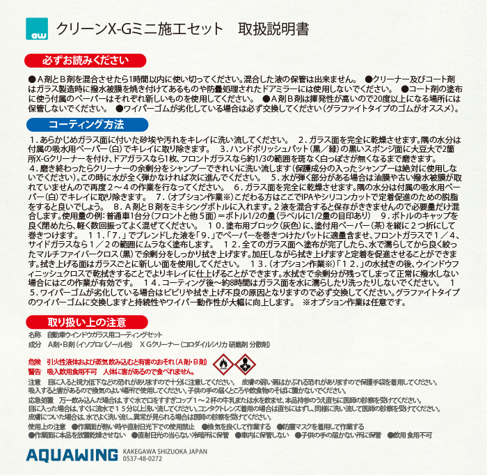 必要なものは全て入っているから 届いたその日に施工可能 アクアウイングで販売するクリーンX-Gαミニ施工セットはプロショップでも愛用されているクリーンX-Gを個人ユーザー様向けに性能はそのままに扱いやすく改良したリメイク商品です。