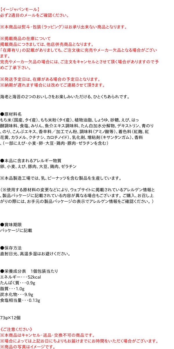 ●原材料名 もち米(タイ産)、植物油脂、しょうゆ(小麦・大豆を含む)、砂糖、えび、はっ酵調味液、食塩、みりん、香 味油、たんぱく加水分解物(卵・大豆・鶏・豚・ゼラチンを含む)、デキストリン、青のり、海苔、魚介エキスパウダー、香辛料、加工でん粉、調味料(アミノ酸等)、乳化剤、紅花色素、紅麹色素、カラメル色素、クチナシ色素、カロチノイド色素、増粘剤(キサンタンガム) ●本品に含まれるアレルギー物質 卵、小麦、えび、豚肉、大豆、鶏肉、ゼラチン ※本品製造工場では、乳、ピーナッツを含む製品を生産しています。